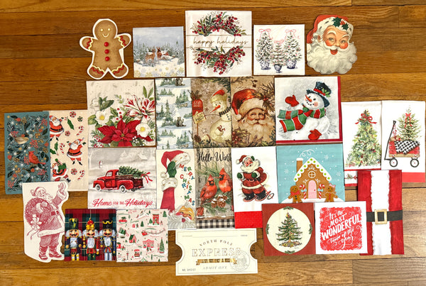 26 Christmas Napkins, Great For Decoupage. You will receive the Christmas napkins shown, 1 of each. In the pictures I have opened the ones that have more than 1 design one them.